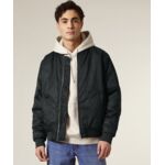 Neutral size label without branding, neck print possible, rip cuff at the hem, side pockets above hem, bomber jacket-style.